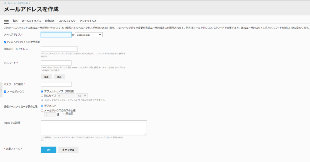 | メールボックス | ※サーバ上へ配置するメールデータサイズを制限したい場合変更してください。 |