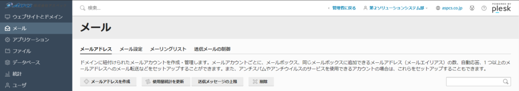 1.管理コンソールへログインし「メール」メニューを開き、「メールアドレスを作成」ボタンをクリックします。
