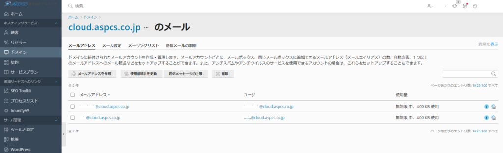 1.管理コンソールへログインし「メール」メニューを開くと、作成されているメールアドレスの一覧が表示されます。メールアドレスをクリックすると編集画面が開きます。