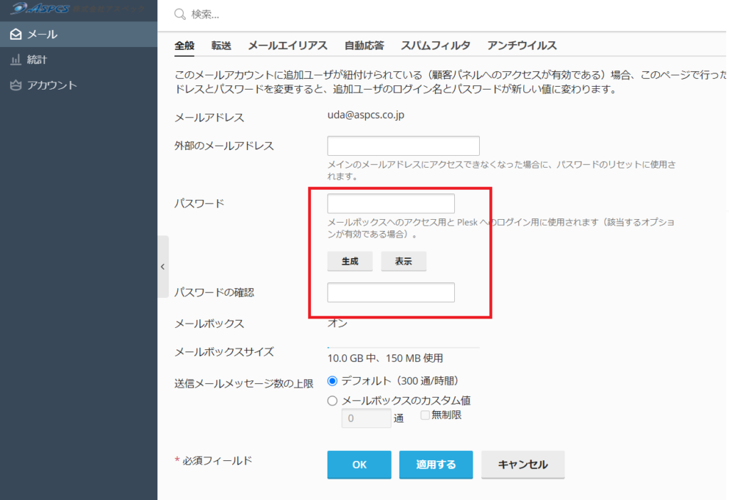 管理コンソールからメールアカウントのパスワードを変更する手順を記載します。
