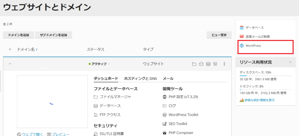 2.トップ画面サイドバーの「WordPress」をクリックします。