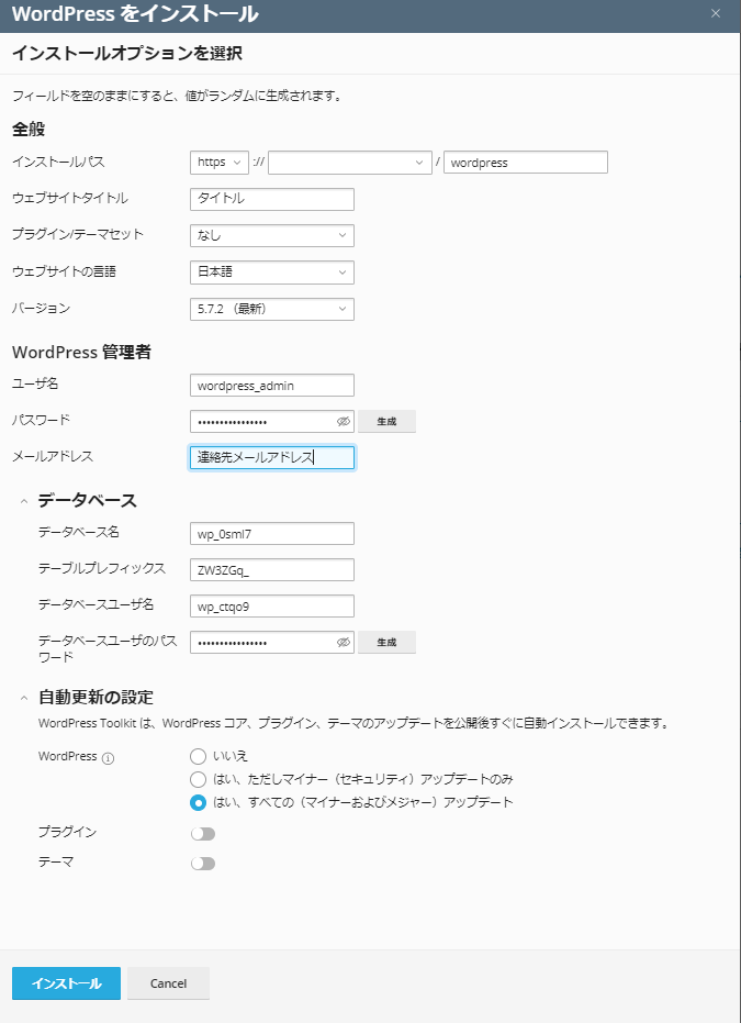 | データベース | ランダムな値が設定されます。通常変更不要です。 |